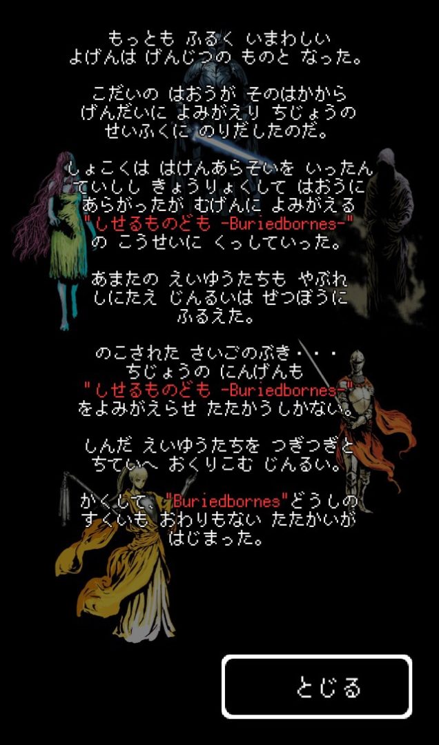 丸太 日々のゲームの記録。Buriedbornes 2017/07/30 21:44 4676 1 Recommended74 Buriedbornes 次のパート 次へ 選択型ローグライク探索ゲーム。 冒険者は狩人マルタ。 移動、戦闘、装備品やスキルの選択など全ての行動を、複数提示される選択肢の中からポンポンと選んで進んでいく探索ゲーム。 技量系の装備品やスキルを集めて調子良くボスを撃破。 順調に進んでたけど選択を間違えたのか一切攻撃が通らない「絶望の傀儡」というモンスターに出会ってしまって死亡。こいつは気をつけないといけないな。 iOSスマホゲーム Buriedbornes ローグライクBuriedbornes 次のパート 次へ ※投稿された画像の著作権等は各権利所有者に帰属しますこの記事を共有するTweet Share LINE Hatena Pocket 関連記事Buriedbornes part2 丸太2017年8月1日Buriedbornes part3 丸太2017年8月3日Buriedbornes part11 丸太2017年9月14日Buriedbornes part5 丸太2017年8月9日Buriedbornes part9 丸太2017年8月28日Buriedbornes part12 丸太2017年9月20日Buriedbornes part6 丸太2017年8月12日Buriedbornes part7 丸太2017年8月16日